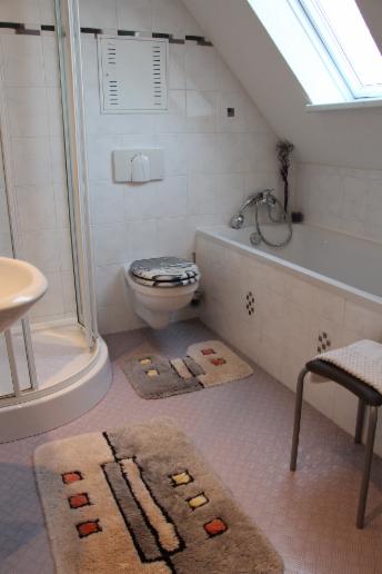 Komfort-Badezimmer mit Badewanne und Dusche, Handtuchwärmer, WC, Waschplatz mit beleuchteten Spiegel, Föhn, Hand- und Badetücher inkl.