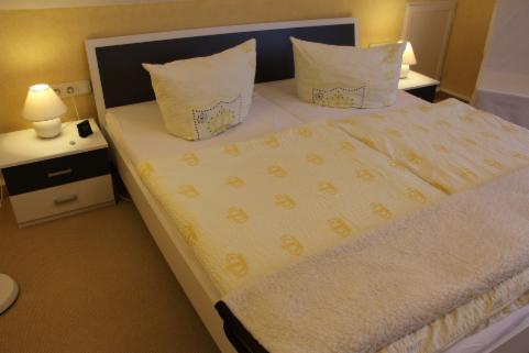 Schlafzimmer mit Doppelbett für süße Träume und großem 4-türigen Kleiderschrank, Zustell- u. Babybett vorhanden