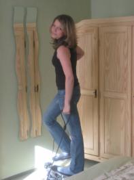 Schlafzimmer mit Sessel, Fitness-Stepper, Ganzkörperspiegel