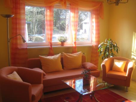 Sonniges Wohnzimmer mit gemütlicher Sitzgruppe, Laminatboden und Aufbettungsmöglichkeit (Klappcouch)