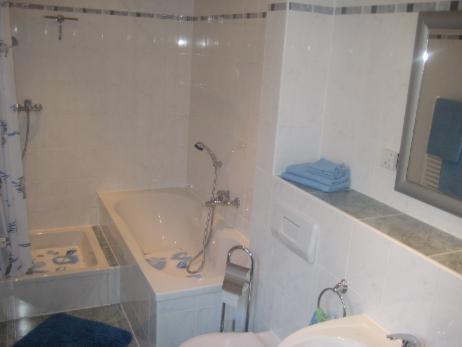 Komfortables Badezimmer mit Dusche, Wanne, Handtuchwärmer, Fußbodenheizung, WC, Waschplatz mit großem Spiegel, Föhn und Handtüchern inkl.